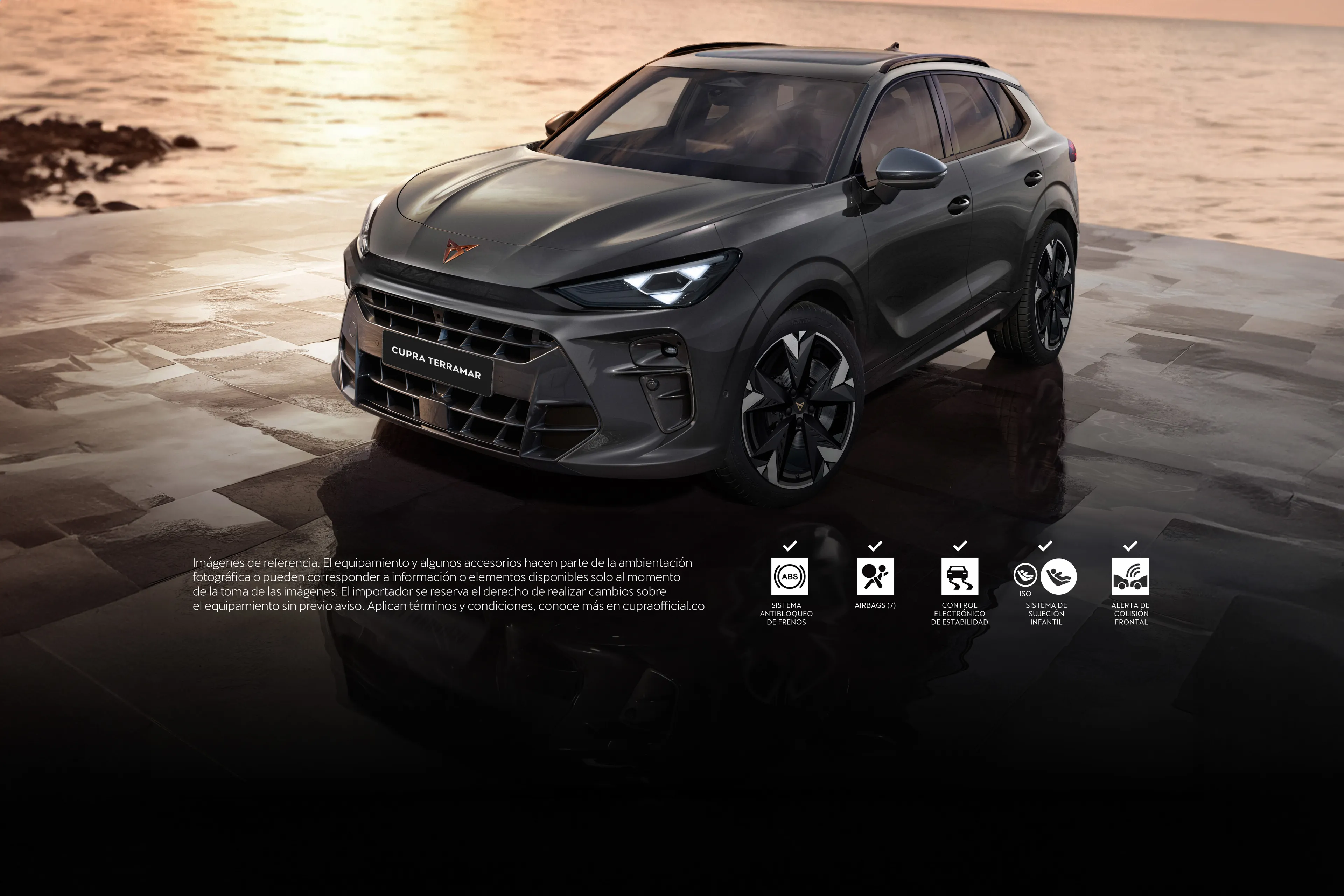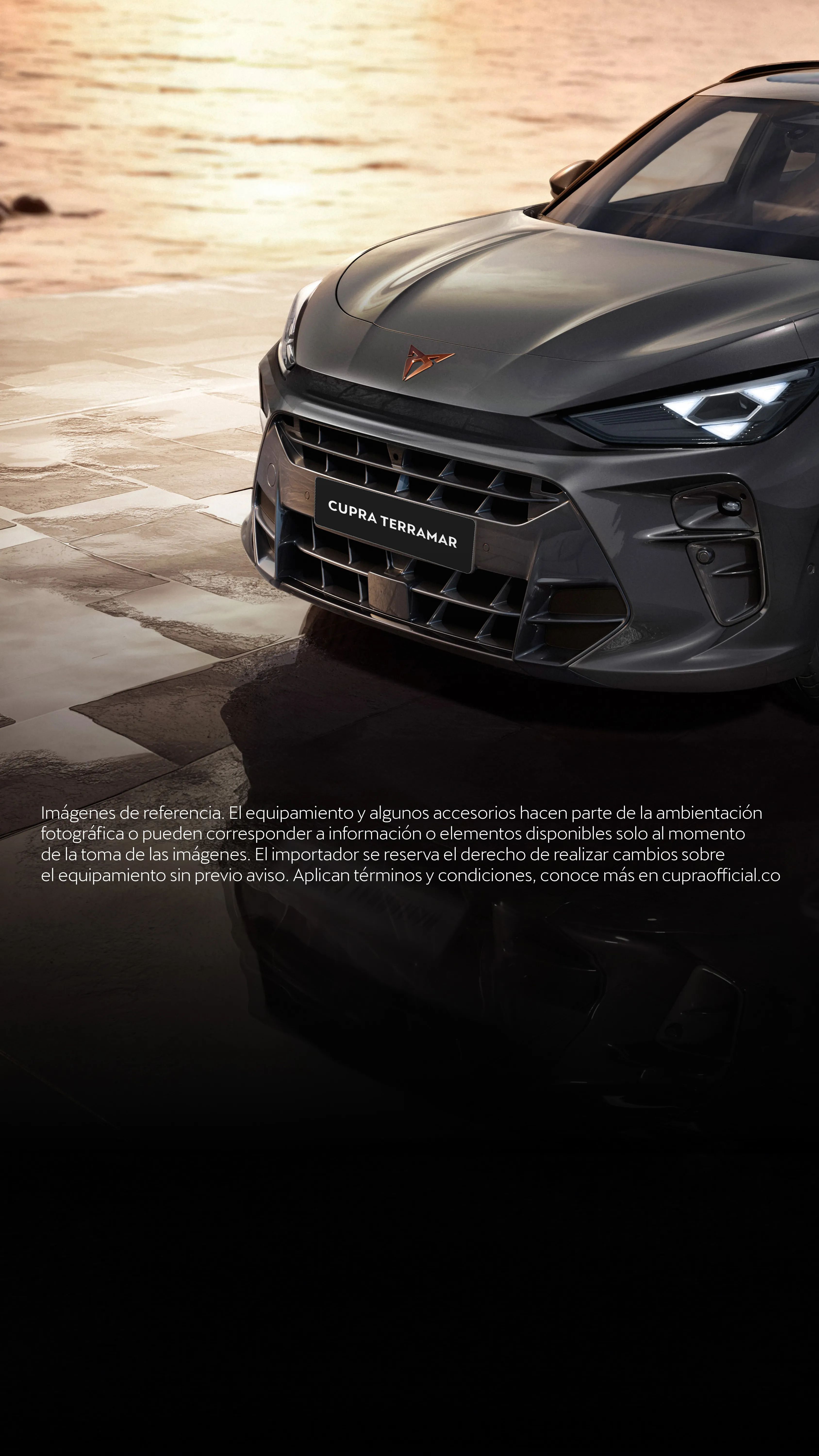 *Imágenes de referencia. Los equipamientos, accesorios y/o colores hacen parte de la ambientación fotográfica o pueden no corresponder con las referencias y modelos comercializados en Colombia o no constituir una referencia exacta del vehículo ofrecido en la red autorizada de concesionarios. Consultar ficha técnica, términos y condiciones disponibles en la página web cupraofficial.co. Oferta válida financiando únicamente con los aliados de Porsche Movilidad Colombia S.A.S. (en adelante “Porsche Movilidad”). Aplica directamente en la red autorizada de concesionarios CUPRA a nivel nacional.